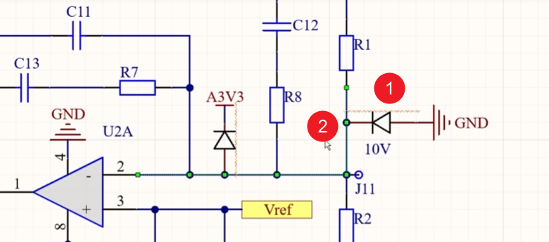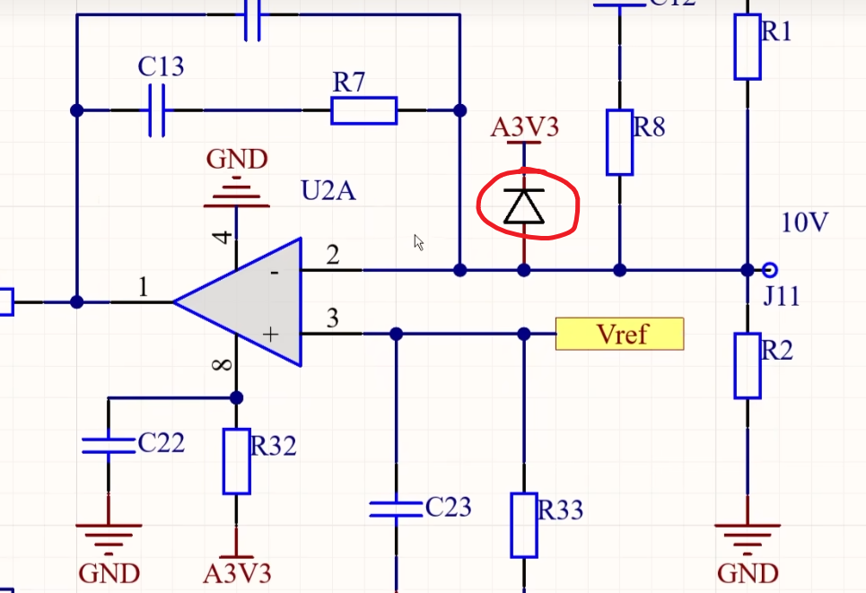 【上钳位二极管】例如这个电路中,二极管后端接 3.3V,那么他的前端电压只要高于 3.3+0.7=4V,二极管就会被导通,也就是说二极管前端电压不可能超过 4V(同样也是运放的输入引脚)。这样也就防止电压过高将运放烧坏