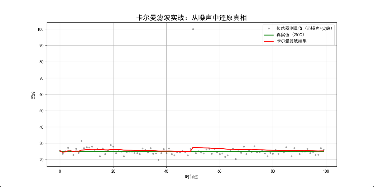 我们要模拟:一个真实的温度信号(平稳),中间突然被一个巨大的噪声干扰,看看卡尔曼能不能把它识别出来。