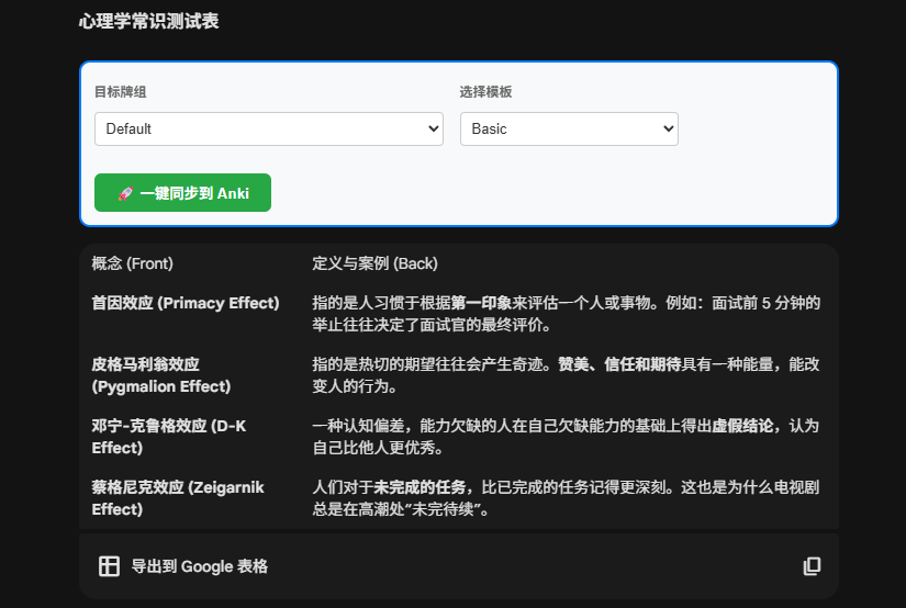 说明:在和 Gemini 对话时,我要求它将一些知识点以 anki 卡片的形式,将正面和反面列举在一个表格中。虽然 Gemini 已经帮我整理好了表格,但是我如果想要导入到 anki 当中,仍然需要不断的复制粘贴,因此想要做一个网页插件