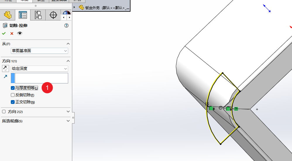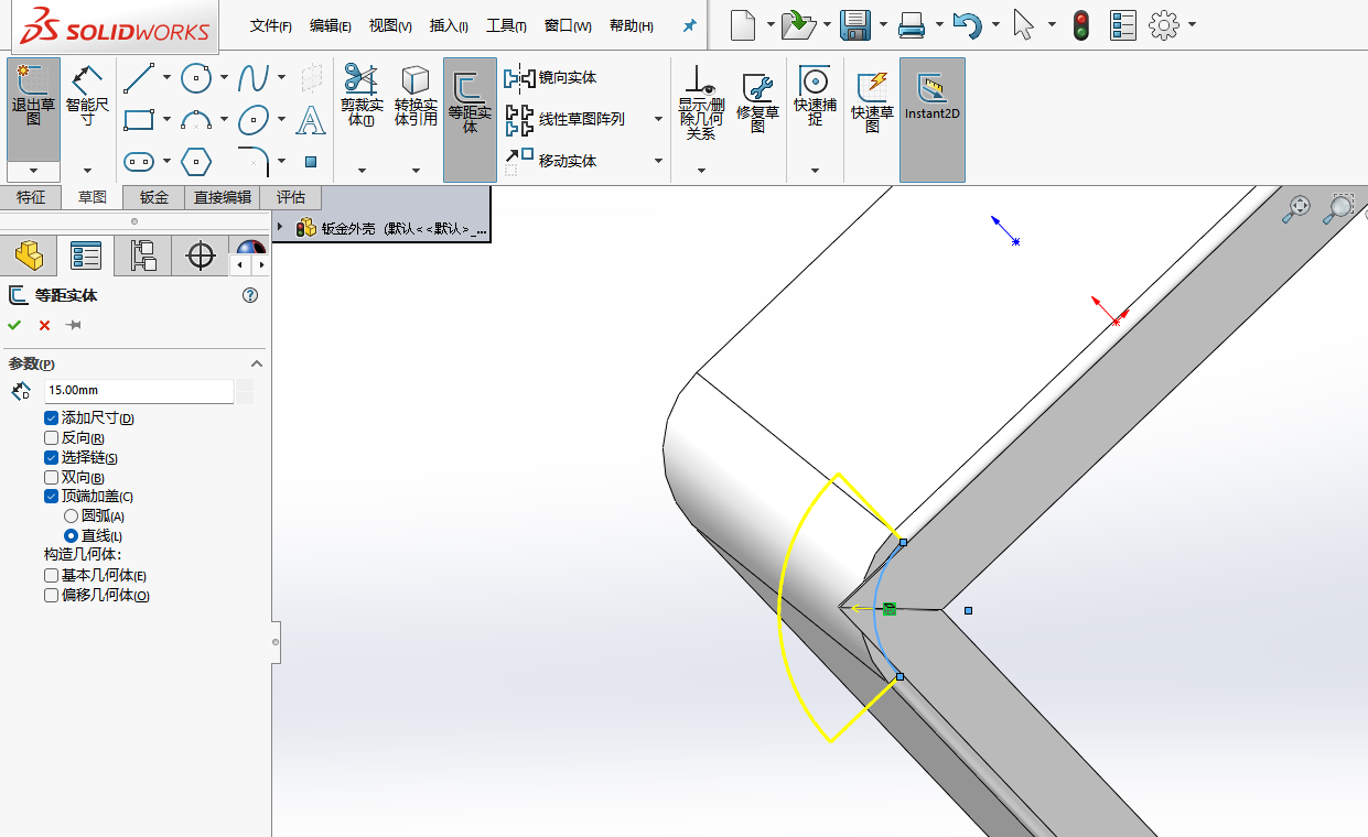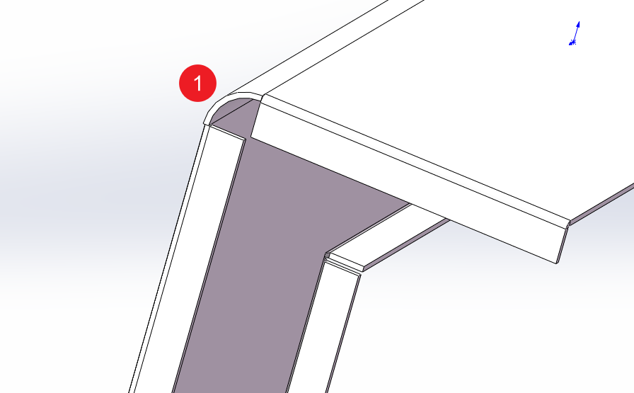 钣金零件圆角处的处理 如下,无论是边线法兰还是斜接法兰,面对这样的圆角,都无能为力 如何处理 闭合角(选择标记 1 处的两个截面) —> 出来一个直角 选择其中一个面,进入草图绘图模式 选中下方的内圆角线,转换实体引用 然后等距实体,记得顶端加盖(直线),让生成的草图模型刚好和要切除的图形一样 拉伸切除即可