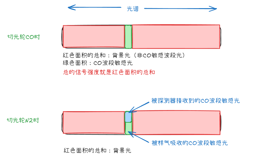 - 轮子转到 CO 格: 测得 $I_{ref}$(样气里的 CO 吸无可吸,因为光已经被小盒子吸干了,所以这个信号不受样气浓度影响,只受粉尘、光源衰减影响)。