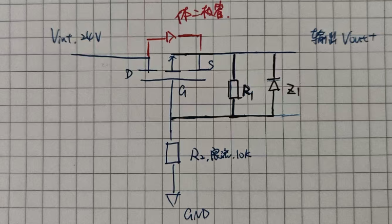 - 【R2 (10k) 保镖电阻】:串在 G-GND 间。当输入电压过高(如 24V),稳压管动作时,R2 负责承担多余电压,限制电流,防止稳压管烧毁。