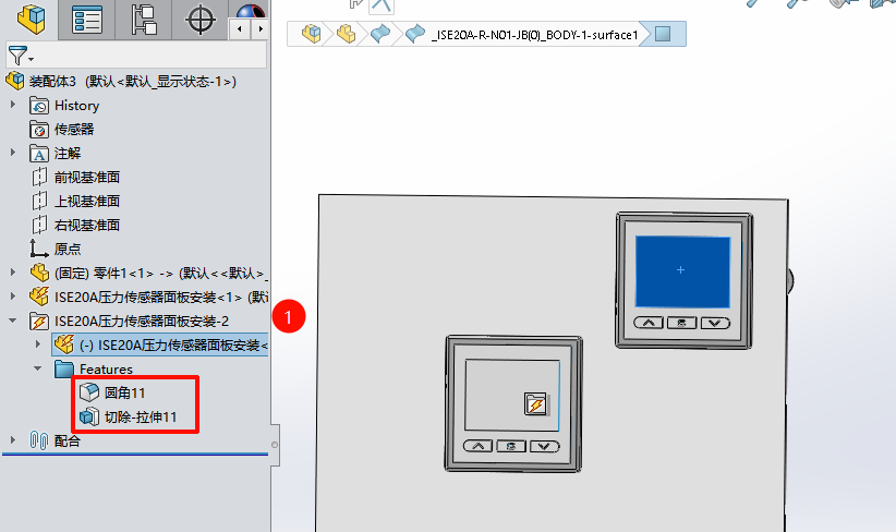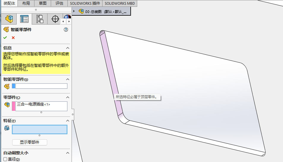- 所选的特征必须属于顶层零件(例如在当前状态下,开孔的面板位于装配体中的子装配体中,那么这个零件下的特征就不能用于制作只能零件)