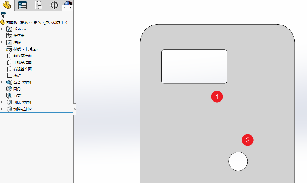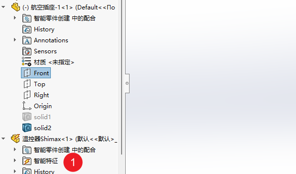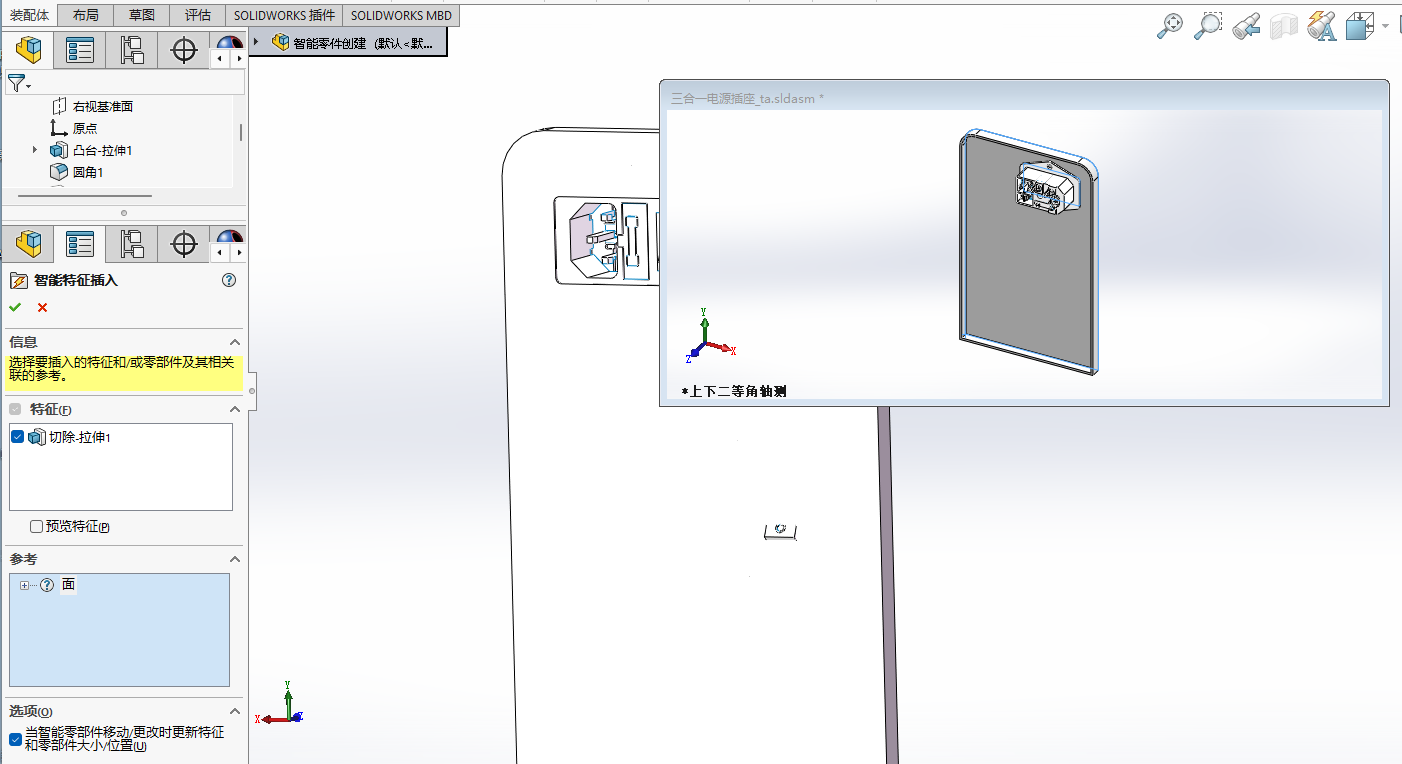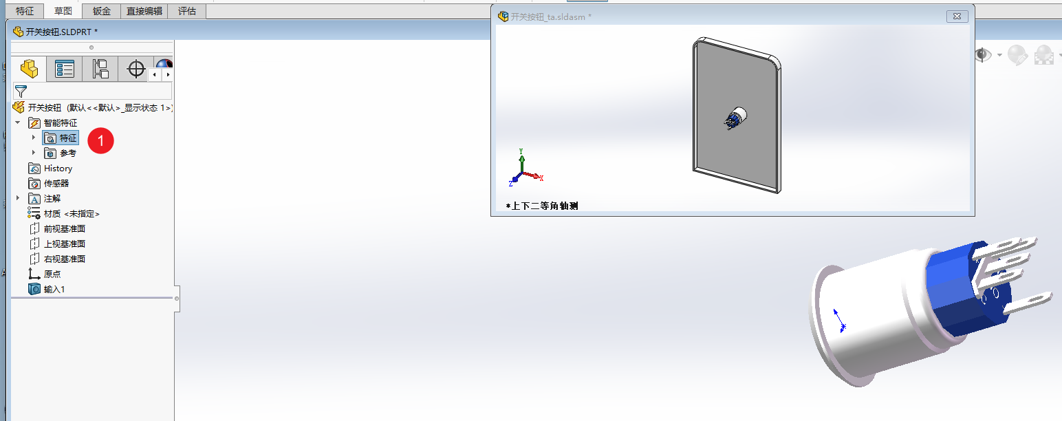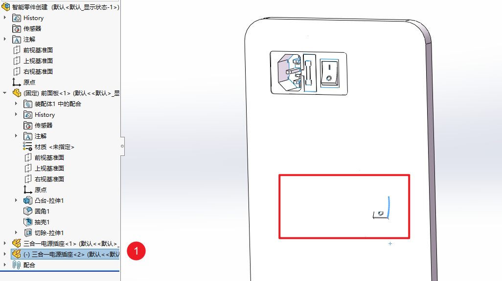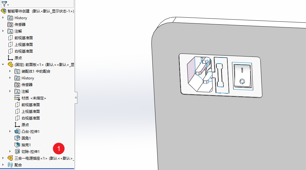 例如这里新建了两个特征,分别对应开关按键和电源插座,提前将特征做好,回到装配体中就可以直接制作智能零件了