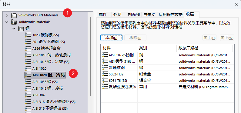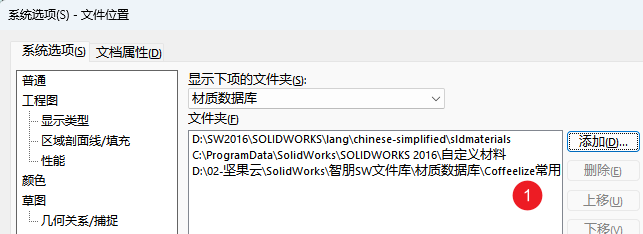 注意,如果添加了材质数据库文件夹,该文件夹下的所有材质数据库文件都会被添加。一些没有用的 .sldmat 文件每次都会重新加载进来