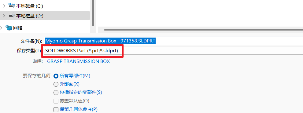 将装配体另存为 sldprt 格式(零件格式),下面有几种保存方式: