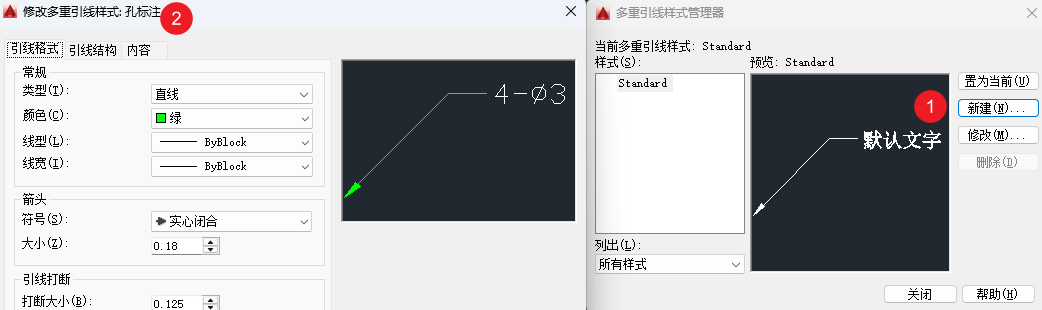 MLS(Multileader Style) 建立一个新样式,命名为“孔标注”。 - 在“内容”选项卡中,预设好文字内容(例如先打个