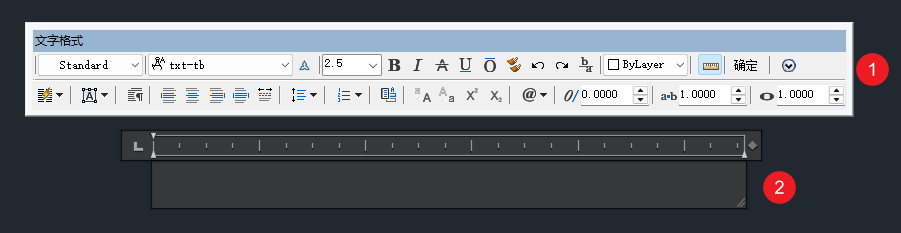 CAD 的新版本中,MT 命令后可能只会出现圈 2 的在位编辑文本框。如果想要切换旧版编辑器(如下图,除了文本框,还有文字格式弹框,方便修改文字格式),可按如下操作: