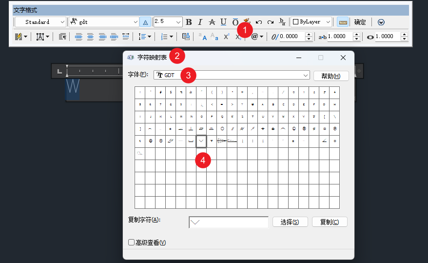 - 将字体切换为 GDT(这是机械制图专用字体)。