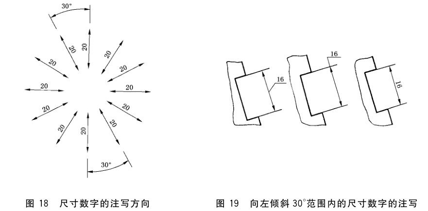 线性尺寸数字的方向,有以下两种注写方法,一般应采用方法 1 注写;在不致引起误解时,也允许采用方法 2。但在一张图样中,应尽可能采用同一种方法。 方法 1:数字应按图 18 所示的方向注写,并尽可能避免在图示 30° 范围内标注尺寸,当无法避免时可按图 19 的形式标注。