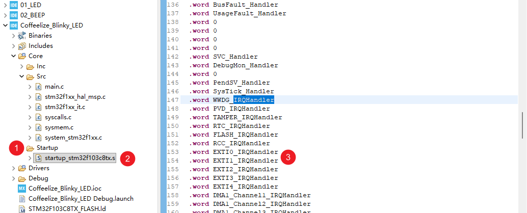 Core -> Startup -> startup_stm32f103c8tx.s(这是一个汇编文件)。 - 打开它,向下拉,你会看到一张巨大的表,全是类似