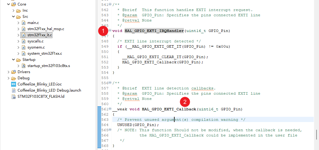 Core -> Src -> stm32f1xx_it.c(it 代表 Interrupt)。 - 这里面已经写好了你开启的那些中断函数。比如你开了外部中断 0,你就能在这里找到: