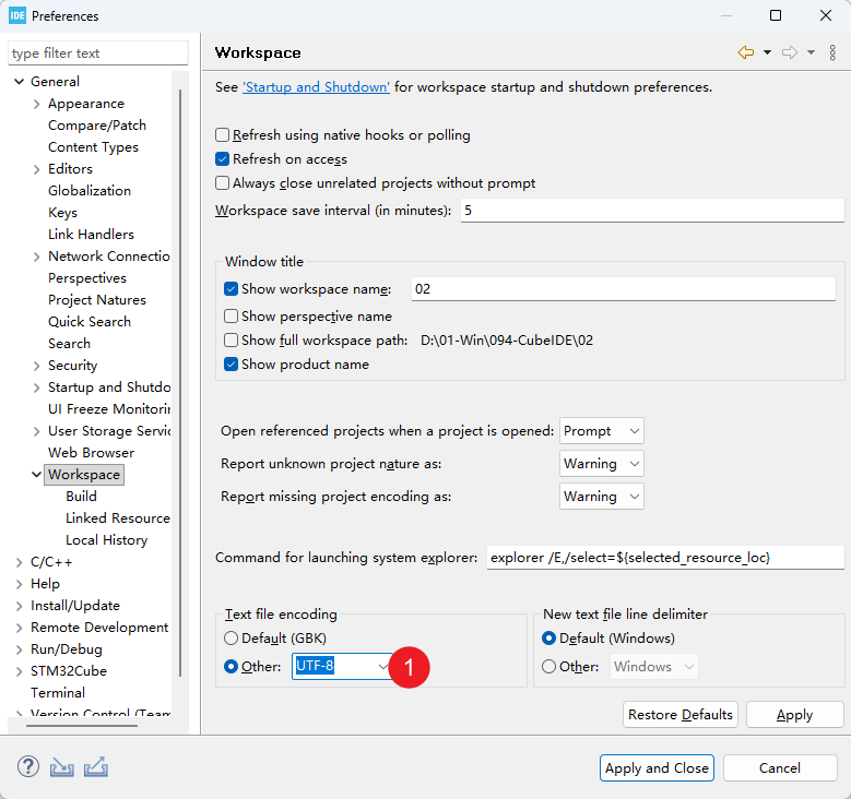 .c或.h文件上 右键 -> Properties。 - 在 Resource 标签页修改 Text file encoding。
