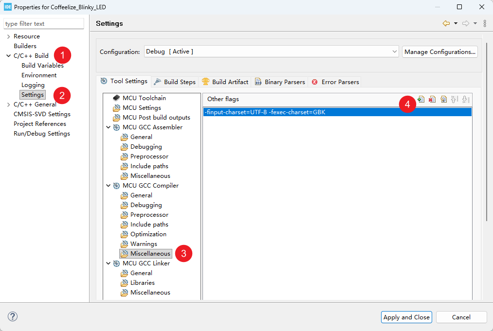 - 在右侧找到 Tool Settings 选项卡,点击 MCU GCC Compiler -> Miscellaneous。
