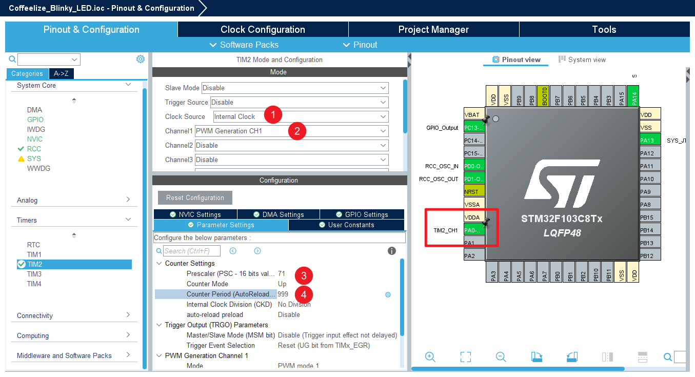 - 启用 PWM 通道:将 Channel 1 设置为 PWM Generation CH1。