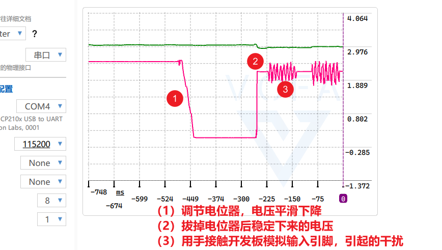 用手摸一下 ADC 的输入引脚,如(3)所示,波形因为人体感应电产生了剧烈的波动,这就是噪声,之后我们会用算法滤掉它