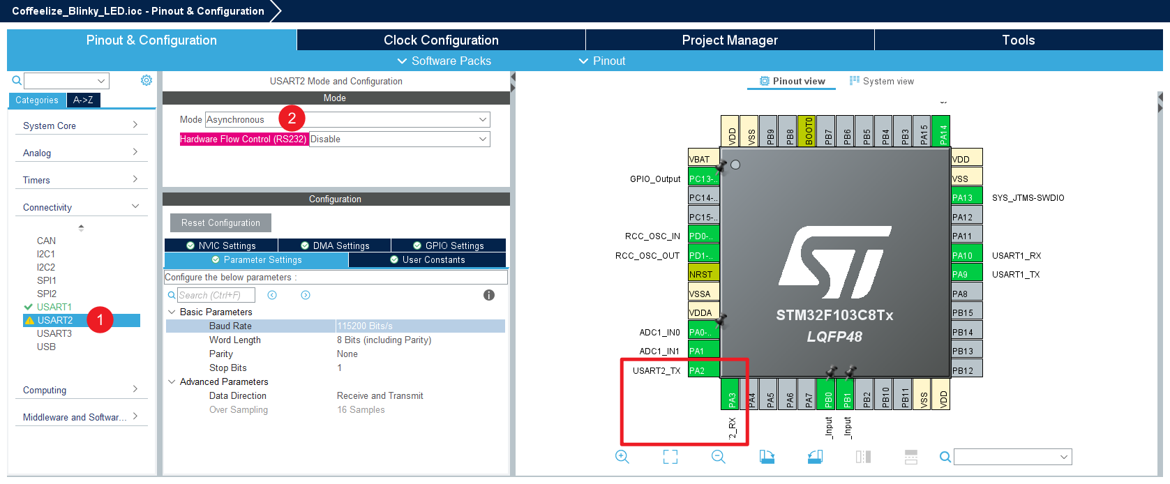- 引脚选择:在左侧引脚树中找到 USART2。