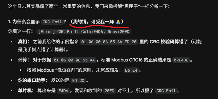 Modbus_CRC16 函数计算后与末尾两字节比对,确保数据在传输过程中没有因为电磁干扰而变质。